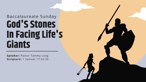 Today is Baccalaureate Sunday. We celebrate the great work God is doing in the lives of our graduates and mark this milestone as they embark on a new chapter in their life’s journey. As we remember the milestones and graduations we experienced, we did not know all that God had for us in the ups and downs yet to unfold. When we look back we can see God’s hand was on our lives doing a great work. So it is important to notice God at work in the lives of our children. You don’t have to be an adult to have a meaningful relationship with God and for God to use you in powerful ways. In the biblical account of David, a teenage boy, and Goliath, a giant, God is doing a great work. Similarly, we face intimidating giants in our relationships, finances, mental or physical health, employment, or any other area that cause worry or stress. Our children and youth face giants also, including school work and grades, bullies, friendship issues, and the stresses of growing up. Giants are all around us, but God is also all around us. Let’s explore how God uses tangible and intangible stones to do a great work in a battle facing the intimidating giants in our lives.