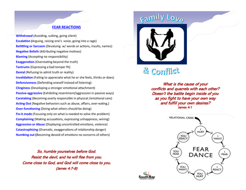 See page 1 of the Family Love & Conflict link for a chart of the relational crisis in the Fear Dance of conflict and its connection to our scripture text of James 4:1.