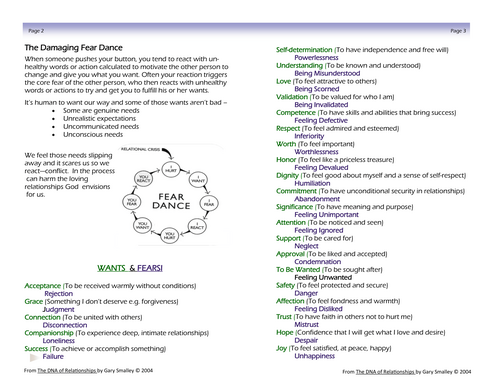 Here are the steps in the process of the Fear Dance of conflict. When someone “pushes our buttons,” or triggers our core fears, we tend to react with unhealthy words or actions calculated to motivate the other person to change and give us what we want. We react out of being hurt. Often, our reaction then hurts the other person and pushes their buttons triggering their core fears. Then they react with unhealthy words or actions to try to get us to fulfill their wants. Before we know it, we have fallen into a full-blown Fear Dance of conflict.