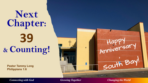 Today, South Bay Community Church is celebrating its 39th anniversary. We reflect on all God has done over these past decades, and look ahead to what God will do in the years ahead, for God never leaves us nor forsakes us. Philippians 1:6: "I am confident of this, that the one who began a good work in you will continue to complete it until the day of Jesus Christ" gives a solid framework as we look back and look forward with our eyes on God. We have completed a series called “Next Chapter” about God’s invitation to live into our purpose, live with passion, live through perseverance, and live in the power of the Holy Spirit. The Greek biblical language in Philippians 1:6 for “you” is plural, not singular; Paul is talking about the good work of the entire community of believers begun in us as the family of the body of Christ. We are called by God to live into our purpose both individually and as a connected community. When living into our passion, we have confidence that ignites joy. When facing challenges, we persevere by God’s Faithfulness. As we live into the Power of Walking in the Holy Spirit, God’s anointing falls on us. With faith in God, we move forward.